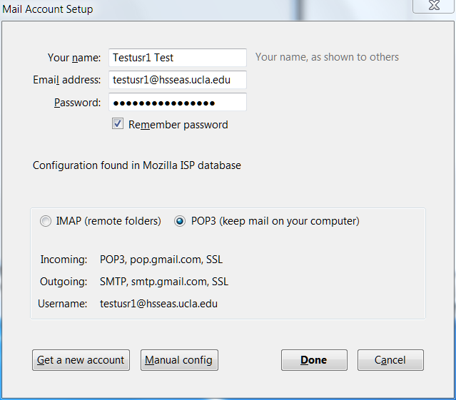 From Thunderbird, Tools > Account Settings > Account Actions > Add Mail Account Your name: (enter your SEAS account loginname) Click Manual config and set it to have the following settings: Incoming: IMAP: server name=mail01.seas.ucla.edu port=143, STARTTLS, Normal password Outgoing: server name=smtp2.seas.ucla.edu port=587, STARTTLS, Normal password) Click Re-test Click Done Once you created it successfully, you may want to change this account's name to something else, such as "username@seas SEASnet IMAP" If you want to use POP3 instead of IMAP: Incoming: IMAP: server name=mail01.seas.ucla.edu port=110, STARTTLS, Normal password