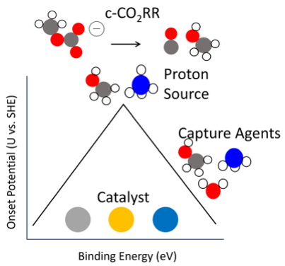 In the group we use ab-initio methods (density function theory) to computationally model the electrochemical c-CO₂RR reaction pathway. We have experience in both thermodynamics and kinetic simulations to model the reactivity of the c-CO₂RR, CO₂RR and the competitive hydrogen evolution reaction (HER). To our knowledge, our group published the first complete cycle of the c-CO₂RR to CO. 2 We determine that the c-CO₂RR requires 3 protonations rather than the 2 needed in the CO₂RR, and thus, we found that the identity of the proton source greatly affects the activity c-CO₂RR. We find that with an NH₄⁺ cation as a proton source, the Ag(111) is more active for c-CO₂RR than the CO₂RR. However, we saw the HER also is highly proton source dependent and therefore, we determined that it was imperative to look for catalysts that significantly hinder the HER. Interestingly, we find that the capture agent has little effect on the overall reactivity. Thus, we find that one must choose a strong proton source and a catalyst that severely hinders the HER for the catalyst to be selective for c-CO₂RR.